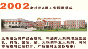 2002年由古山食品廠喬遷至北京市平谷區(qū)興谷經(jīng)濟(jì)開發(fā)區(qū),公司占地面積從10余畝擴(kuò)至50畝,產(chǎn)品從單一的腐乳生產(chǎn)增加料酒的生產(chǎn)由傳統(tǒng)手工制作轉(zhuǎn)入機(jī)械自動化生產(chǎn)!此階段公司產(chǎn)品由腐乳、料酒兩大系列增加至腐乳、料酒、醬油、醋、火鍋調(diào)料五大系列,同時市場格局已經(jīng)打開,產(chǎn)品輻射全國各地市!